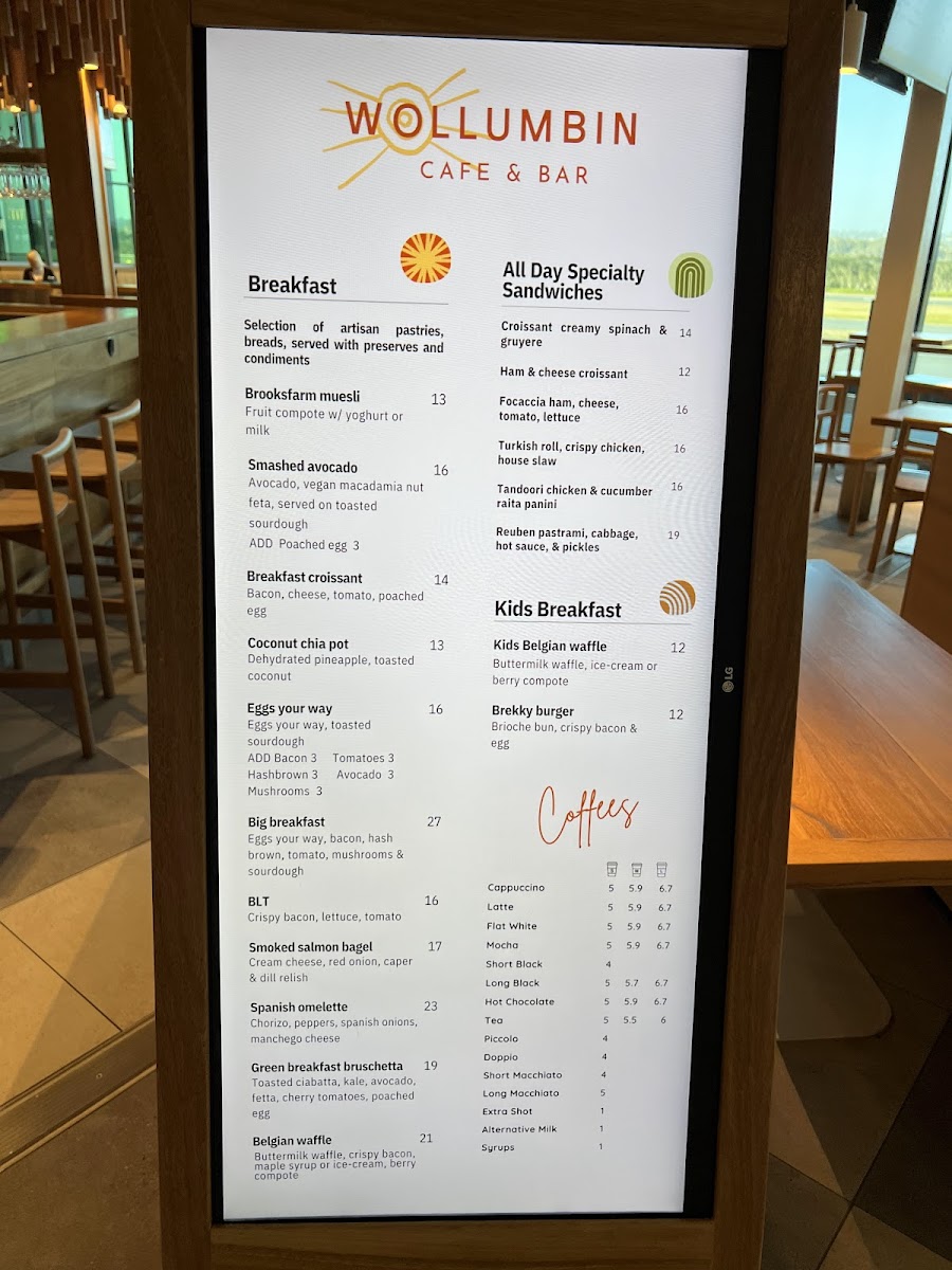 The menu is appropriate for travelers and visitors seeking quick service for breakfast or casual meals, as well as those looking for coffee shop staples and bar service at the International Terminal in Gold Coast Airport.